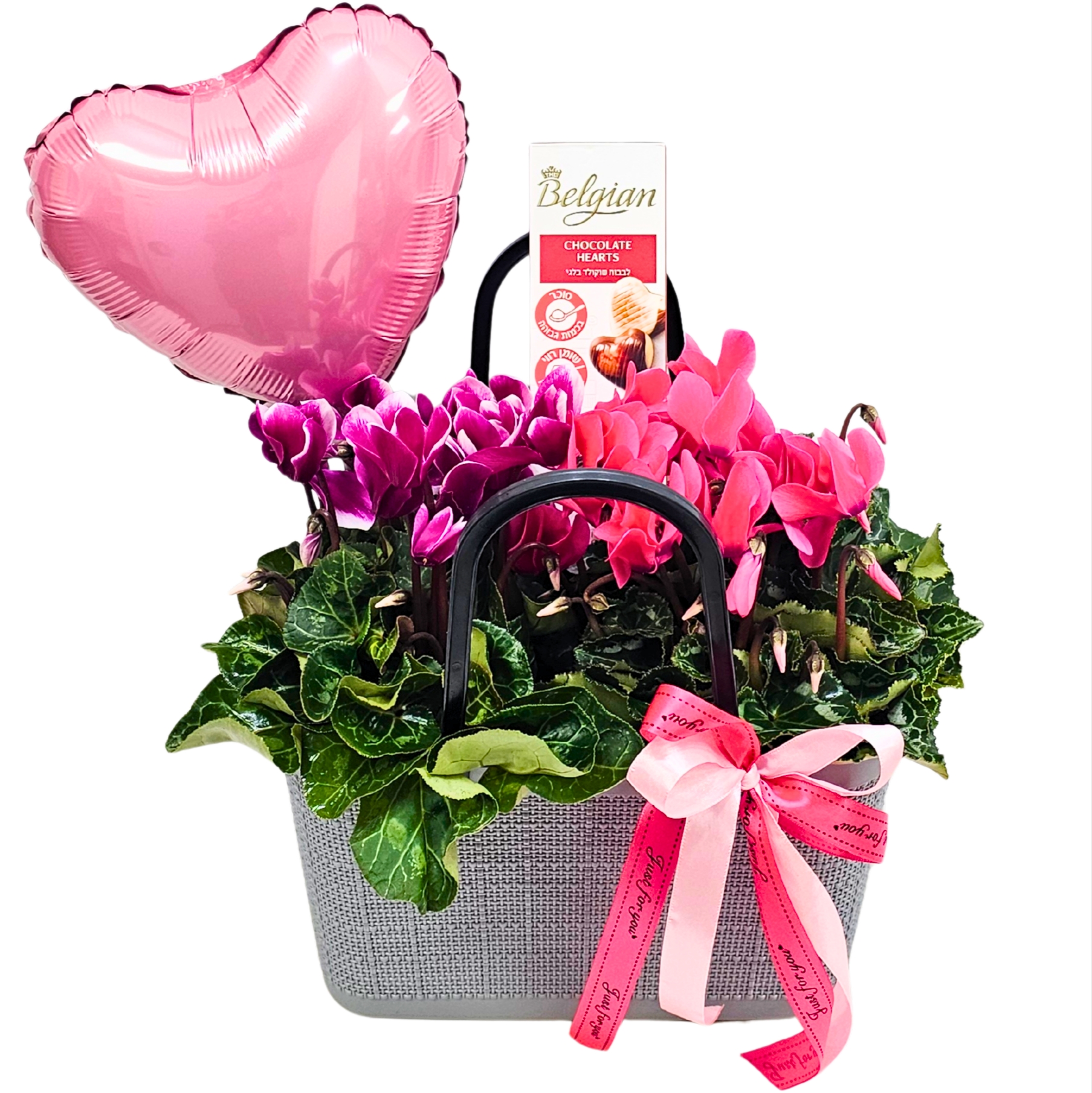 רקפות בסלסלה פלסטיק מעוצבת עם בלון ושוקולד בלגי קטן (65 גר)